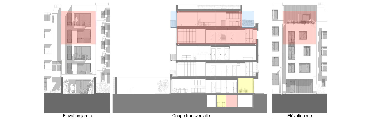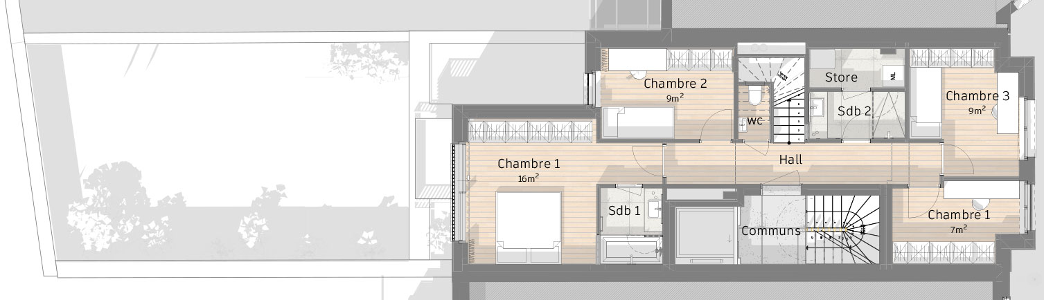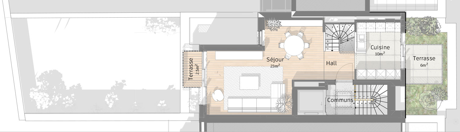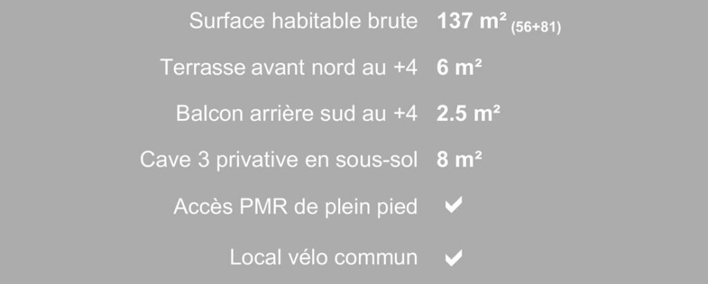 Le Penthouse-Duplex (Étages +3 & +4) : L’Excellence à Ciel Ouvert Véritable joyau de la résidence, ce penthouse en duplex de 137 m² est une “villa sur le toit” qui offre une expérience de vie absolument unique. Distribué sur les deux derniers étages, il culmine avec une terrasse de 2.5 m² orientée plein sud, offrant une vue imprenable sur l’intérieur l’îlot et un ensoleillement maximal. Une seconde terrasse de 6 m² en façade avant offre une alternative et des vues différentes. L’intérieur, avec ses trois chambres, son bureau, sa salle de bain et sa salle de douche, est un havre de paix et de luxe, où chaque détail a été pensé pour offrir un confort sans compromis au sommet de la ville.